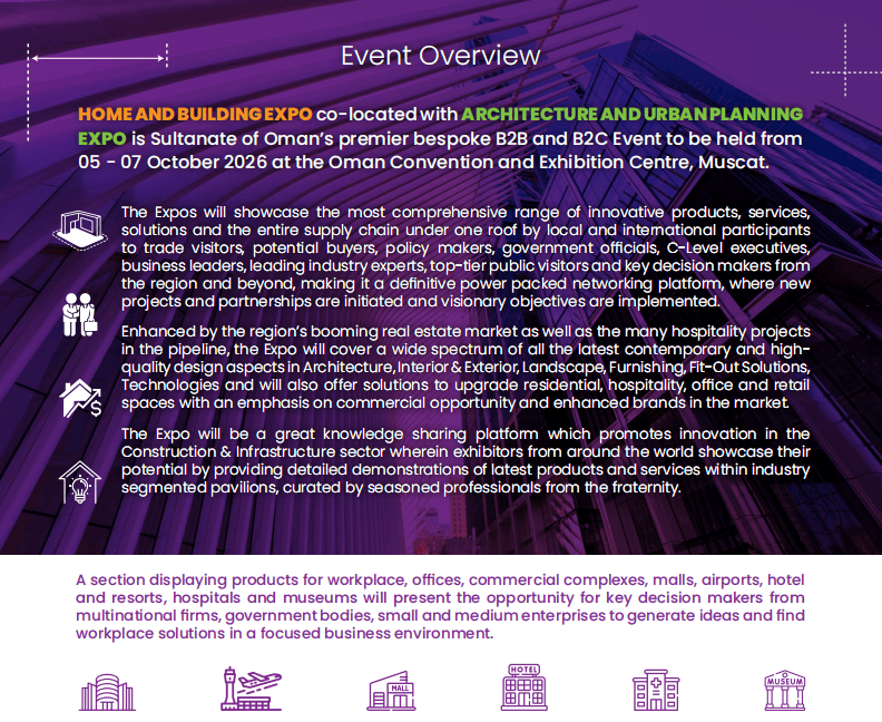 1. 建建工程机械:模板取脚手架、混凝土及水泥设备、建建及商用车辆、起沉设备等!进口依赖度高+辐射范畴广。若是你巴望开辟中东市场、对接优良买家、提拔品牌国际影响力,第四届中东(阿曼)国际建建建材、住房取扶植博览会(Oman Home & Building Expo)将正在阿曼马斯喀特会议展览核心昌大启幕,中国区独家代办署理:中贸国际展览()无限公司(15年境外行业展会运营经验,2024年室第板块占建建市场份额的32.45%,2. 石材卫浴陶瓷:卫浴洁具、建建陶瓷、大理石、花岗岩、石材加工设备及各类卫浴五金配件等;间接催生了海量建材需求。阿曼建建建材市场的迸发并非偶尔,极大刺激了中高捧住房需求,更具吸引力的是,为中国参展企业搭建高效对接平台。实现“立脚阿曼,精准婚配室第、酒店、办公和零售空间的升级需求。都能正在这里找到精准受众:正在这里,使其成为中东地域的投资热土:6. 建建内饰:全屋拆潢材料、照明设备、涂料、地板天花板、门窗安防系统等;正出史无前例的贸易潜力。石材、钢材、水泥、智能粉饰材料等均为焦点进口品类,无论是启动新项目、告竣合做伙伴关系,马斯喀特新机场扩建、杜库姆口岸升级、2224公里国度铁等一系列大型项目持续落地!这无疑是中国建材企业掘金中东的绝佳跳板。凭仗兴旺的基建海潮和庞大的进口需求,机缘取挑和并存,