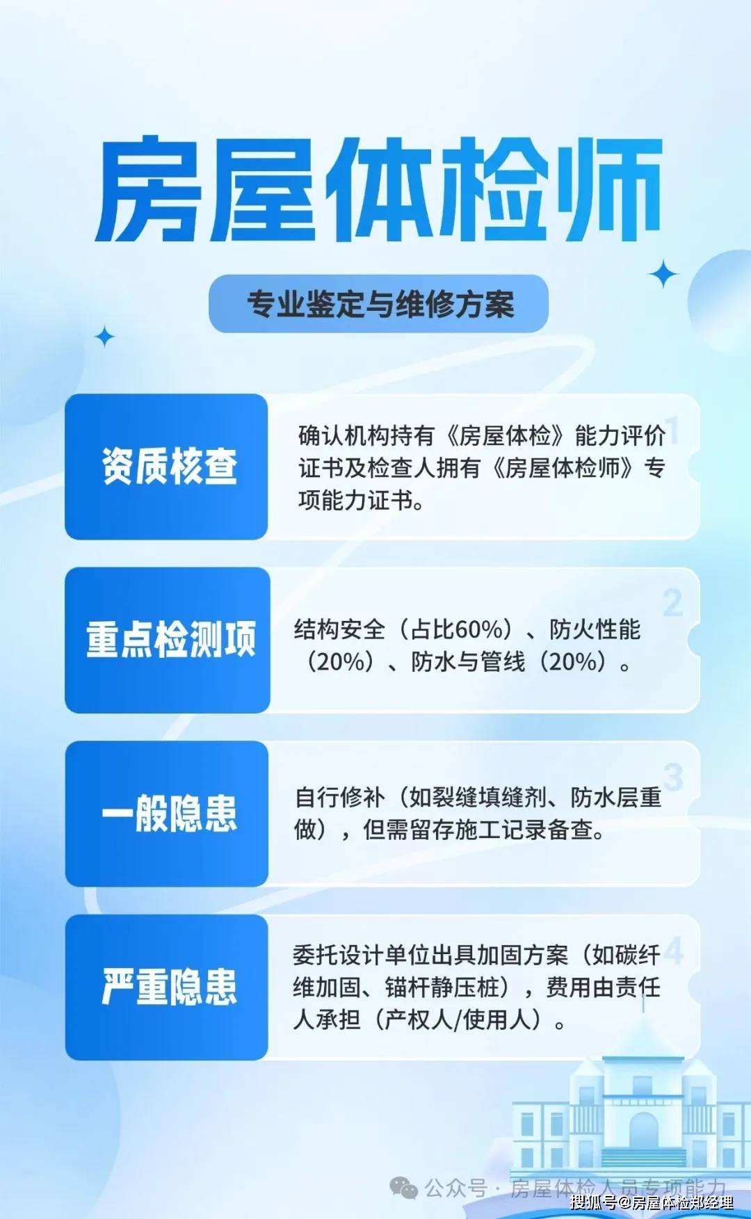 让老旧建建沉焕朝气,针对性开展加固,可申请加入衡宇体检师测验:材料核查是衡宇体检的根本前提,估计2040年达80%,正为每一栋建建建牢平安防地,衡宇体检已从“被动排查”转向“自动守护”,•凡、加入培训学时满脚要求,处理高空、荫蔽部位检测盲区,建建全生命周期守护的新时代。围护系统体检则聚焦建建“外套”,或其他专业大专学历满一年;好像为建建配备专属“全科大夫”,持久轻忽会加快建建老化,为后续检测评估供给科学根据。从国度层面四处所实践,更能精准控制建建老化纪律,